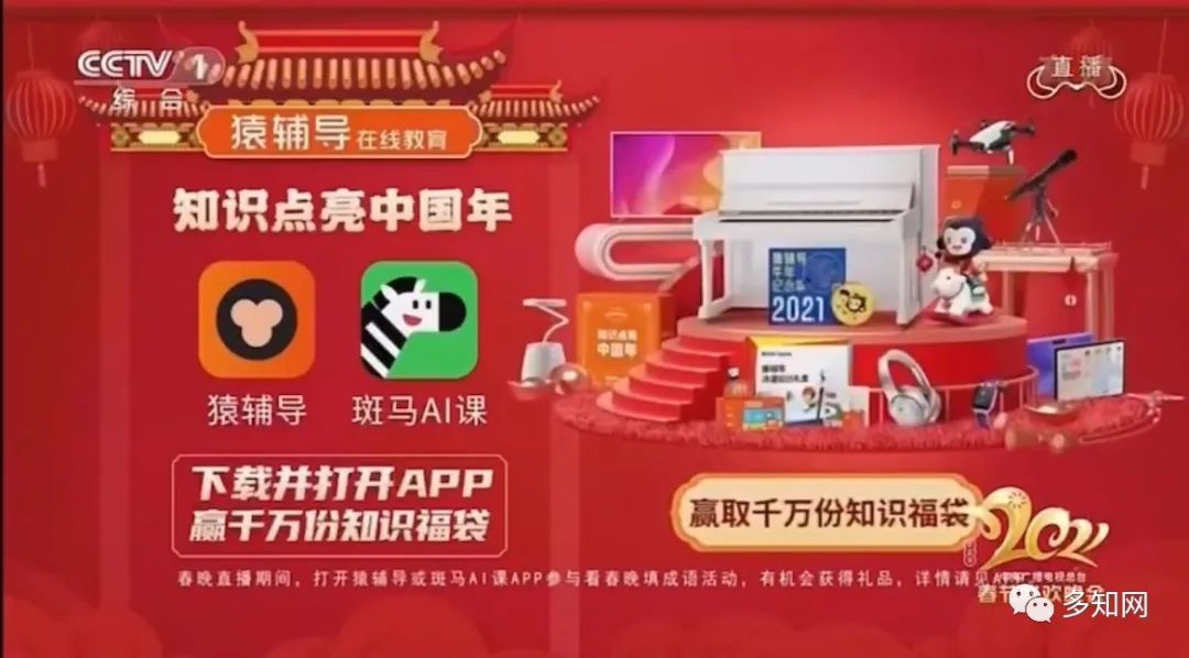 今年,猿輔導(dǎo)再次與春晚合作,2020年春晚口播了猿輔導(dǎo)。而今年,猿輔導(dǎo)與春晚合作又進(jìn)一步。一種形式是主持人口播介紹猿輔導(dǎo)的“知識(shí)福袋”活動(dòng),一種是植入在小品《陽臺(tái)》中。
