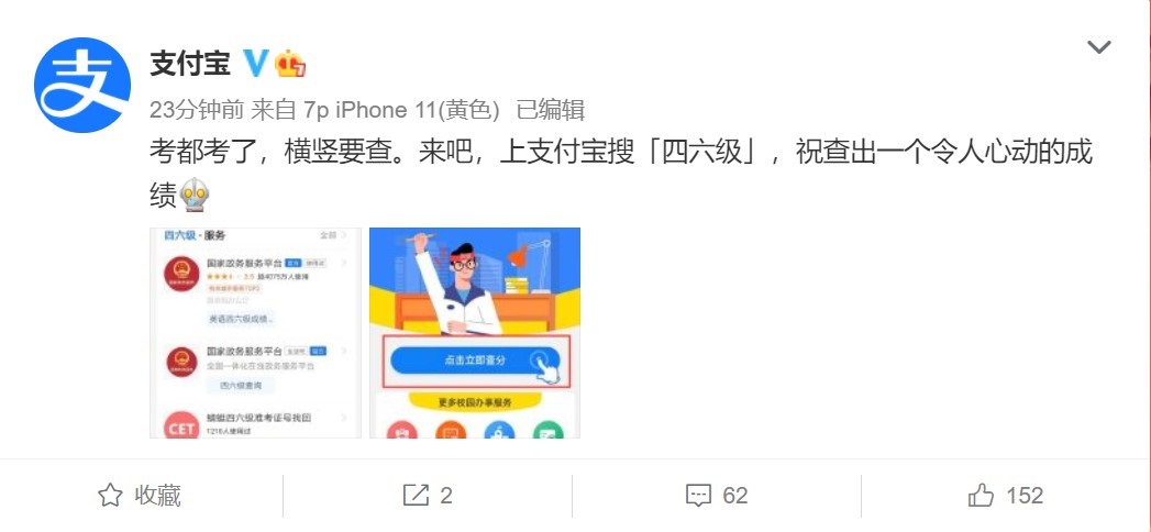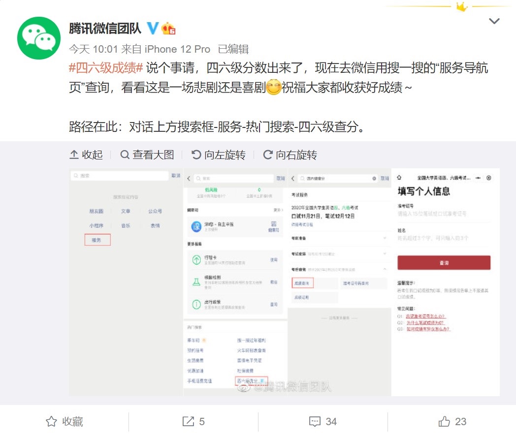 今日午間,@支付寶 微博發(fā)文稱,用戶可通過支付寶搜索 “四六級”查分。26日上午,微信也發(fā)布消息稱,微信搜一搜聯(lián)合國家政務(wù)服務(wù)平臺為廣大考生提供四六級成績查詢服務(wù)。屆時,廣大考生可通過微信搜一搜進(jìn)行四六級查分,具體路徑為:對話上方搜索框 - 服務(wù) - 熱門搜索 - 四六級查分。
