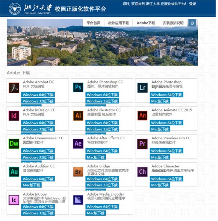 你還在為是否購(gòu)買昂貴的正版Adobe軟件而發(fā)愁嗎?是否為繁鎖的破解方法而苦惱嗎?別擔(dān)心,這都不是問(wèn)題,浙大師生福利來(lái)了,Adobe系列軟件9月25日起在學(xué)校正版化軟件平臺(tái)(http://soft.zju.edu.cn/)正式上線。