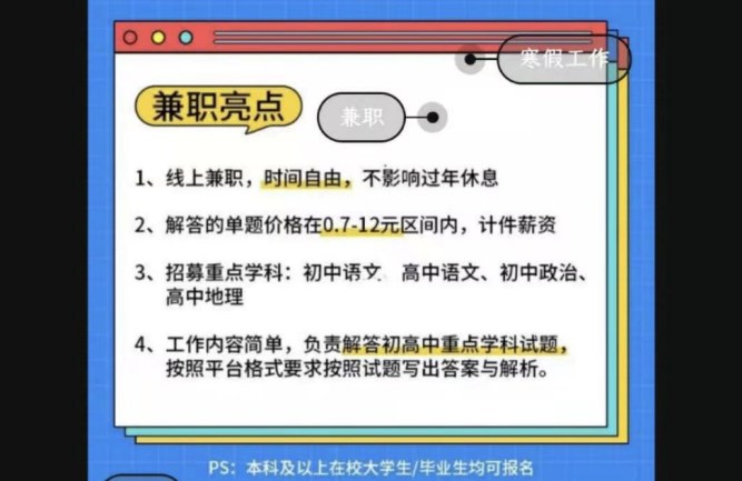 她的說法也在部分在線教育、“拍題”平臺的答主招募宣傳上得到了印證。懂懂筆記發(fā)現(xiàn),部分兼職答主的招募廣告上都表示,只要本科以上學(xué)歷即可報名,優(yōu)秀的應(yīng)屆畢業(yè)生也可以在線兼職。