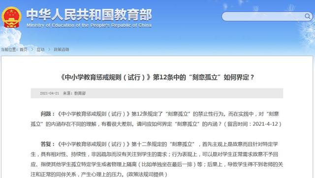 4月21日,教育部回應(yīng)《中小學(xué)教育懲戒規(guī)則(試行)》中的“刻意孤立”如何界定:主觀上故意且針對特定學(xué)生,具有相對性、持續(xù)性;行為表現(xiàn)上,對學(xué)生正常需求故意不回應(yīng)、指使其他學(xué)生孤立特定學(xué)生或物理上隔離(如單獨(dú)坐在最后一排)等。