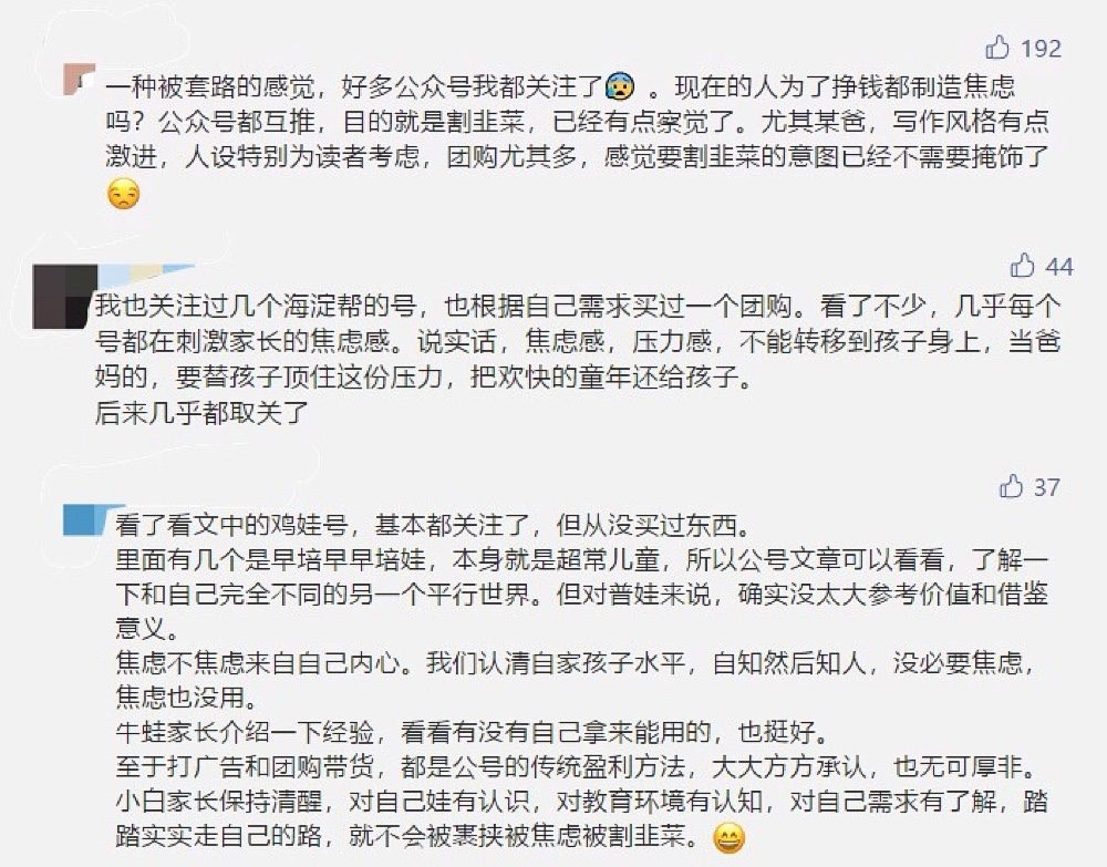 “雞娃號”一事曝光后,不少教育類自媒體賬號發(fā)文稱自己也曾被類似的公司找過,對方提出收編其賬號,并為其提供內(nèi)容、流量和運(yùn)營的扶持,幫助精準(zhǔn)漲粉,再通過團(tuán)購等形式實(shí)現(xiàn)盈利。