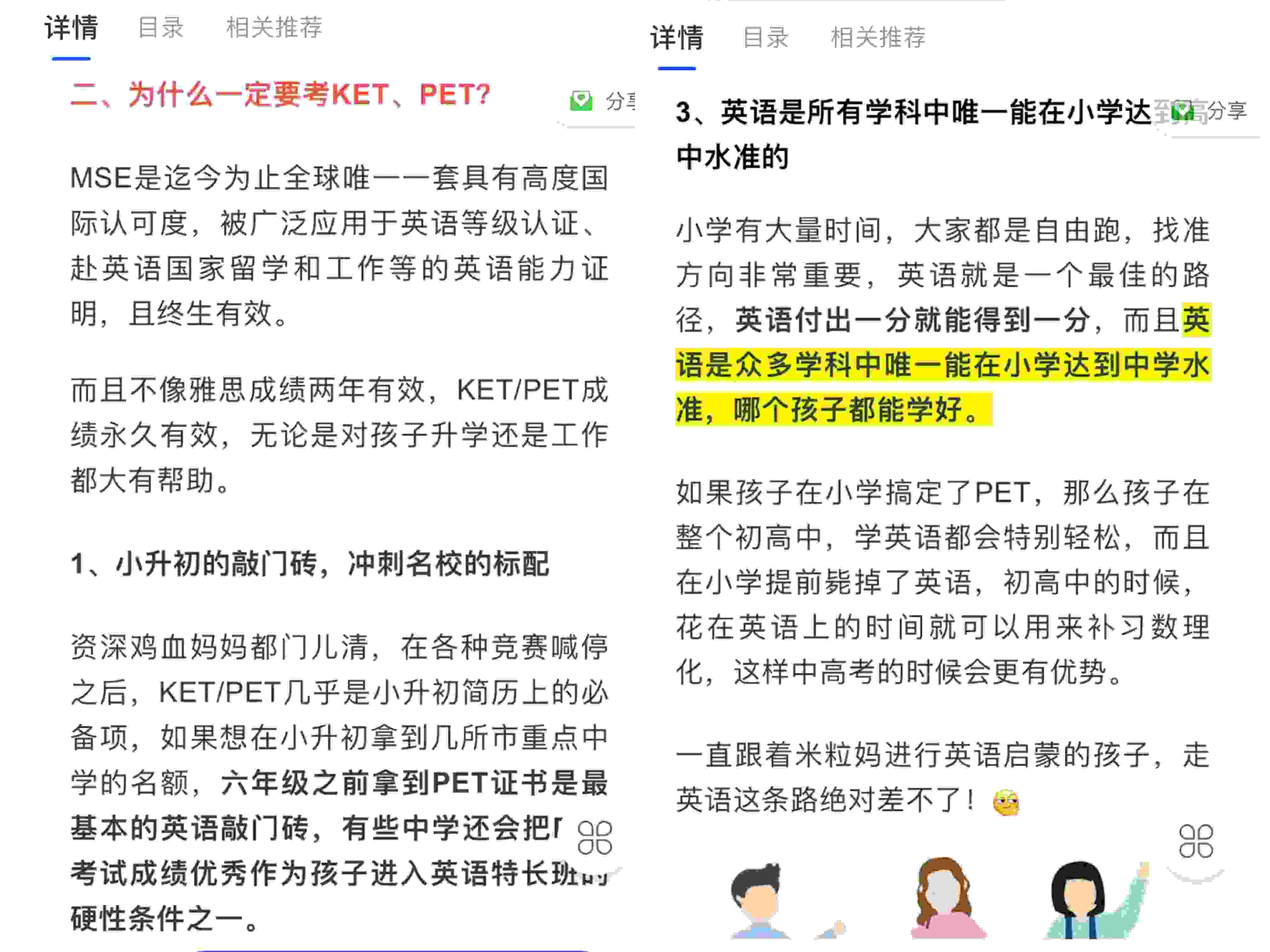 在課程詳情中,KET和PET考試卻被稱作“小升初的敲門磚,沖刺名校的標(biāo)配”,甚至提到,“英語是眾多學(xué)科中唯一能在小學(xué)達(dá)到中學(xué)水準(zhǔn),哪個(gè)孩子都能學(xué)好”,直指“超前教育”。列表顯示,有2409人花費(fèi)349元開通了KET課程;PET課程售價(jià)399元,已有795人開通。