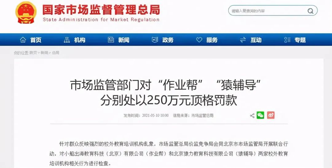 5月10日,國家市場監(jiān)督管理總局發(fā)布通告,稱作業(yè)幫及猿輔導存在虛假宣傳及誘騙消費者交易等行為,被北京市市場監(jiān)管局處以警告和250萬元罰款的行政處罰。