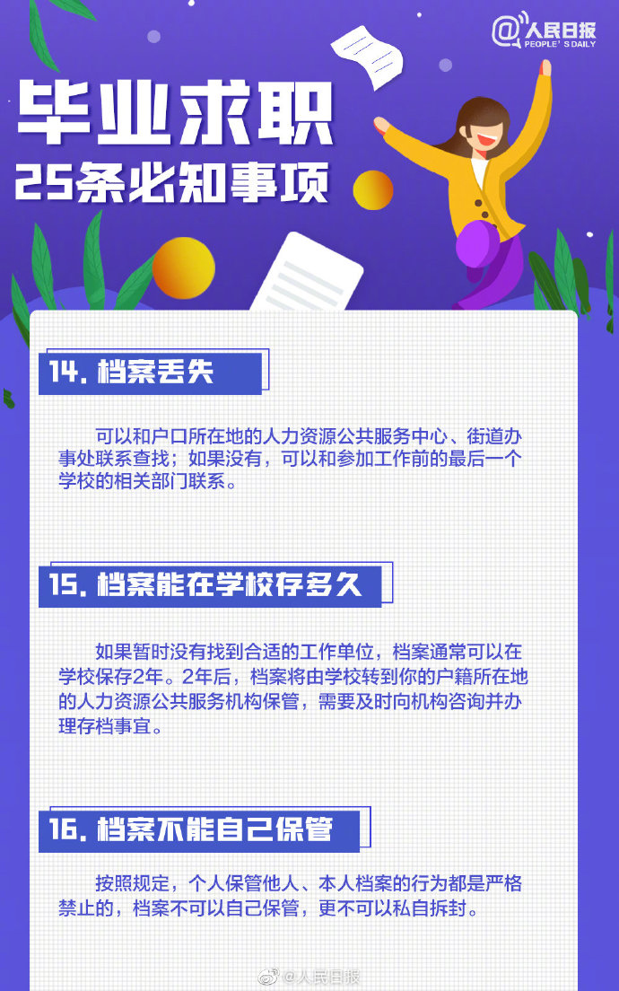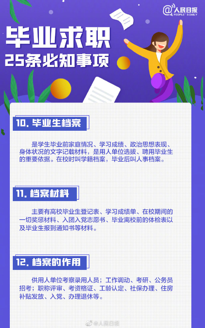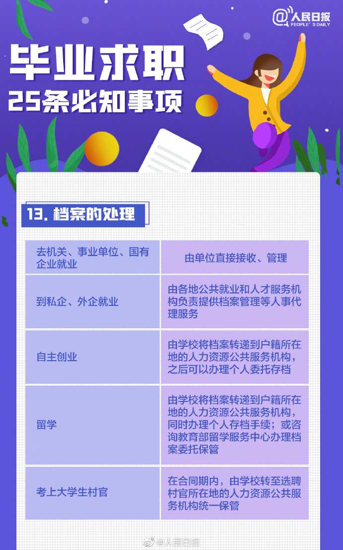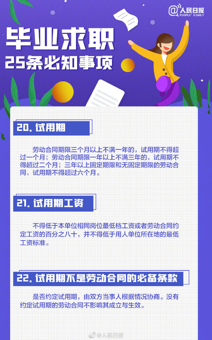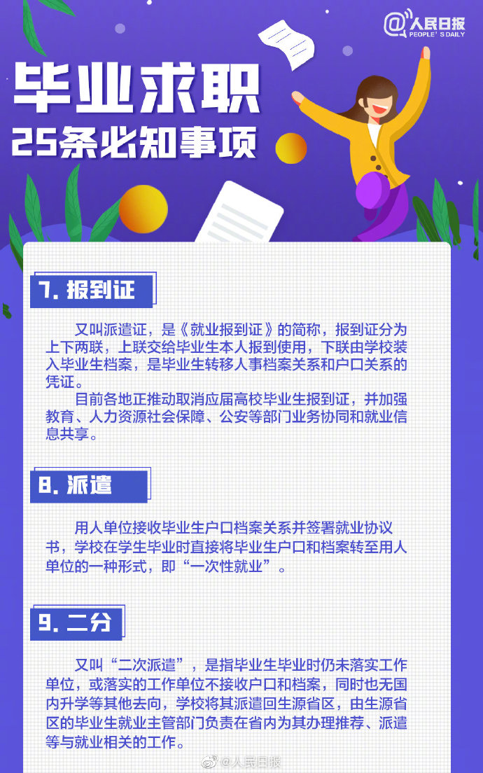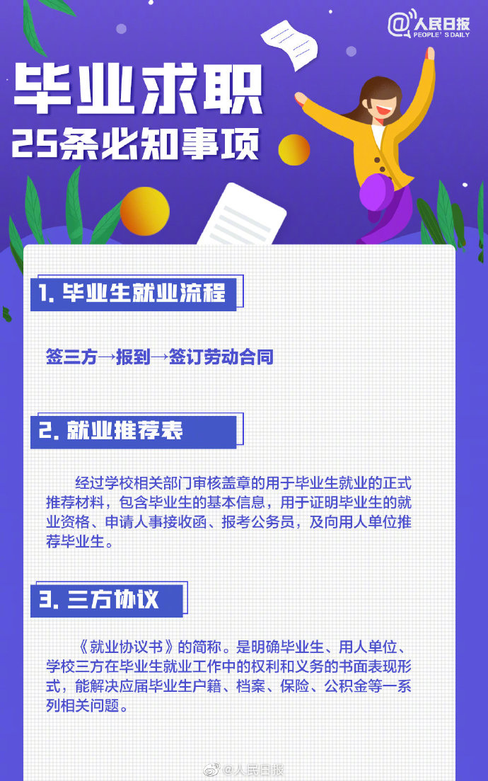 2021-05-13 09:41:26閱讀()人民日報離2021年畢業(yè)季已不到50天,今年高校畢業(yè)生總規(guī)模預計909萬人。即將畢業(yè)的你是否還在忙著投簡歷、找工作?派遣、二分、檔案、試用期……這些詞,你都搞清楚了嗎?簽勞動合同要關(guān)注哪些要點?求職前,這些事你應(yīng)該了解↓↓轉(zhuǎn)給即將離校的你,祝一切順利,畢業(yè)快樂! ????