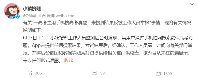剛剛,小猿搜題官方也發(fā)布公告,對有關(guān)“一高考生用手機(jī)搜高考真題,未搜到結(jié)果反被工作人員舉報”事情,現(xiàn)將有關(guān)情況說明如下:
