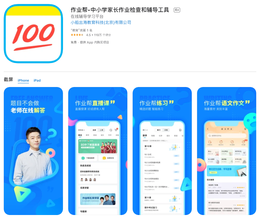 作業(yè)幫是Baidu于2014年1月推出的一款支持Android以及iOS平臺(tái)的K12在線教育類型的App,累計(jì)激活用戶設(shè)備突破8億,月活用戶約1.7億。