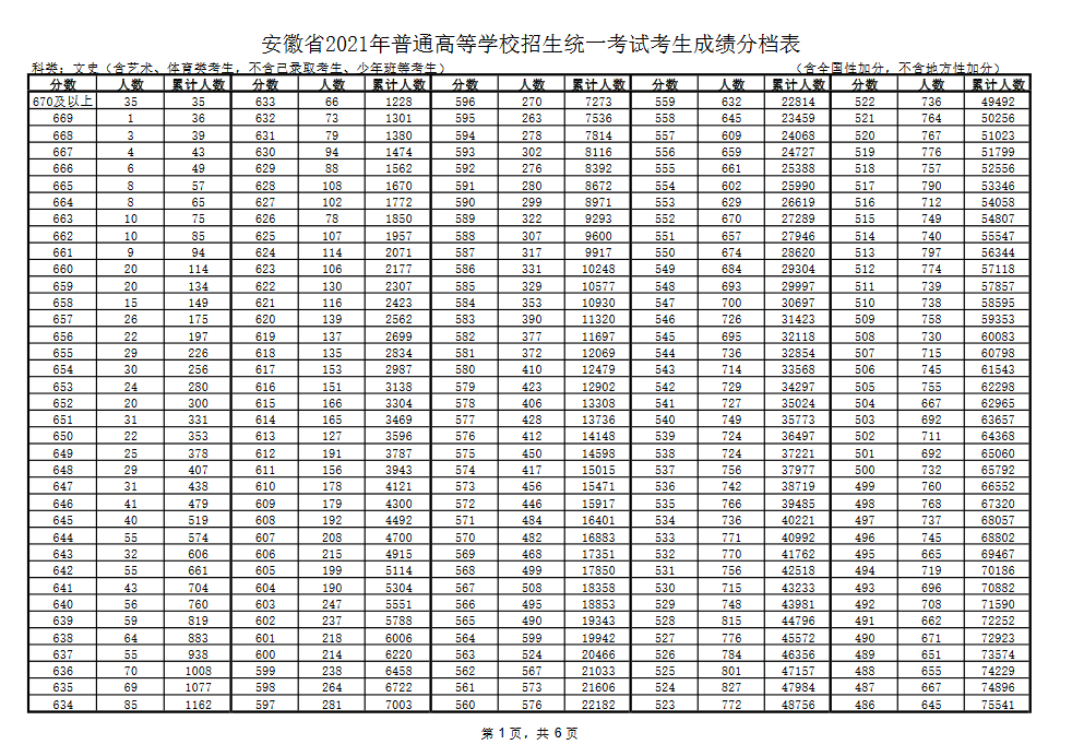 安徽省2021年普通高等學(xué)校招生統(tǒng)一考試考生成績分檔表公布,文科670分及以上,35人;理科697分及以上,36人。