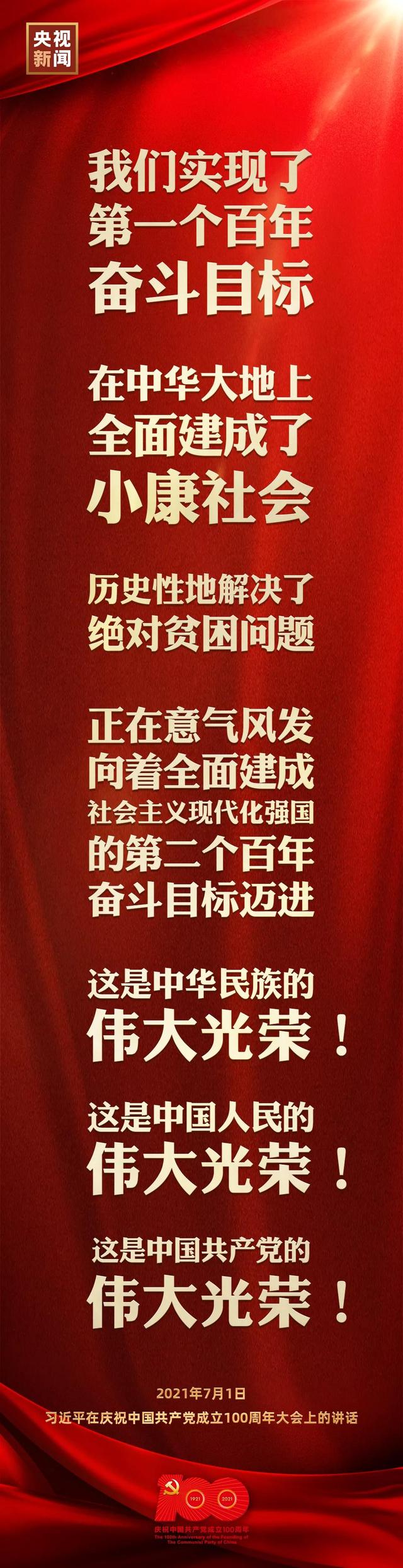 習近平代表黨和人民莊嚴宣告,經(jīng)過全黨全國各族人民持續(xù)奮斗,我們實現(xiàn)了第一個百年奮斗目標,在中華大地上全面建成了小康社會,歷史性地解決了絕對貧困問題,正在意氣風發(fā)向著全面建成社會主義現(xiàn)代化強國的第二個百年奮斗目標邁進。這是中華民族的偉大光榮!這是中國人民的偉大光榮!這是中國共產(chǎn)黨的偉大光榮!