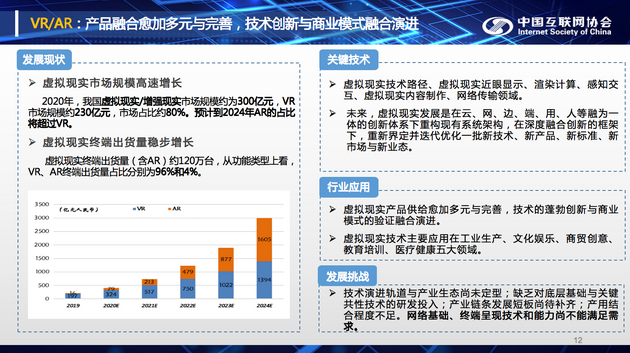 報告顯示,我國虛擬現(xiàn)實(shí)市場規(guī)模高速增長。2020年,我國虛擬現(xiàn)實(shí)/增強(qiáng)現(xiàn)實(shí)市場規(guī)模約為300億元,VR市場規(guī)模約230億元,市場占比約80%。預(yù)計到2024年AR的占比將超過VR。虛擬現(xiàn)實(shí)終端出貨量穩(wěn)步增長,虛擬現(xiàn)實(shí)終端出貨量(含AR)約120萬臺,從功能類型上看,VR、AR終端出貨量占比分別為96%和4%。