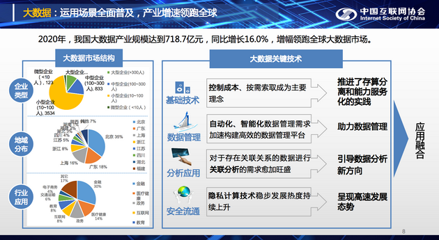 報告顯示,2020年我國大數(shù)據(jù)產(chǎn)業(yè)規(guī)模達(dá)到718.7億元,同比增長16.0%,增幅領(lǐng)跑全球大數(shù)據(jù)市場。其中大數(shù)據(jù)市場結(jié)構(gòu)方面,大型企業(yè)(>300人)共有523家,中型企業(yè)(100~300人)共833家,小型企業(yè)(10~100人)共有3534家,微型企業(yè)(<10人)有123家。
