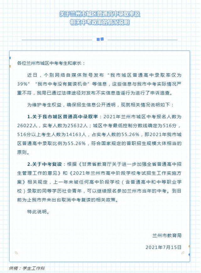 2021-07-16 11:16:23閱讀()蘭州市教育局7月16日電 蘭州市教育局15日在官方微信公眾號(hào)上發(fā)布《關(guān)于蘭州市城區(qū)普通高中錄取率及相關(guān)中考政策的情況說(shuō)明》稱,近日,個(gè)別網(wǎng)絡(luò)自媒體賬號(hào)發(fā)布“蘭州市城區(qū)普通高中錄取率僅為39%”“蘭州市中考沒(méi)有復(fù)讀機(jī)會(huì)”等信息,這些信息與蘭州市中考實(shí)際情況嚴(yán)重不符,蘭州市教育局已通過(guò)法律途徑對(duì)發(fā)布不實(shí)信息造謠行為進(jìn)行了申訴追查。