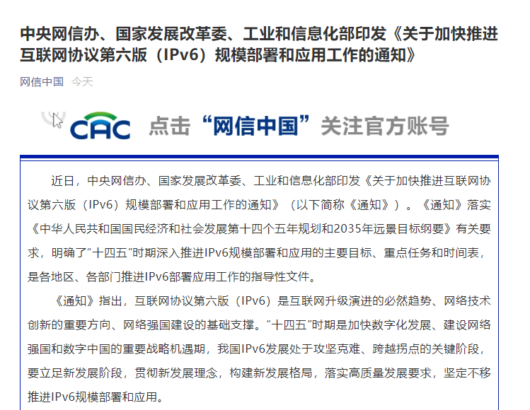 互聯(lián)網(wǎng)協(xié)議第六版(IPv6)是互聯(lián)網(wǎng)升級演進的必然趨勢、網(wǎng)絡技術(shù)創(chuàng)新的重要方向、網(wǎng)絡強國建設的基礎支撐。2017年,以習近平同志為核心的黨中央作出推進IPv6規(guī)模部署行動的戰(zhàn)略決策。三年多來,各地區(qū)、各部門認真貫徹落實《推進互聯(lián)網(wǎng)協(xié)議第六版(IPv6)規(guī)模部署行動計劃》,推動IPv6規(guī)模部署取得顯著進展。“十四五”時期是加快數(shù)字化發(fā)展、建設網(wǎng)絡強國和數(shù)字中國的重要戰(zhàn)略機遇期,我國IPv6發(fā)展處于攻堅克難、跨越拐點的關(guān)鍵階段,面臨不進則退、緩進亦退的風險挑戰(zhàn)。為貫徹落實習近平總書記關(guān)于網(wǎng)絡強國的重要思想,根據(jù)《國民經(jīng)濟和社會發(fā)展第十四個五年規(guī)劃和2035年遠景目標綱要》有關(guān)要求,全面深入推進IPv6規(guī)模部署和應用,加快促進互聯(lián)網(wǎng)演進升級,經(jīng)中央網(wǎng)絡安全和信息化委員會同意,現(xiàn)就加快推進IPv6規(guī)模部署和應用工作的有關(guān)事項通知如下: