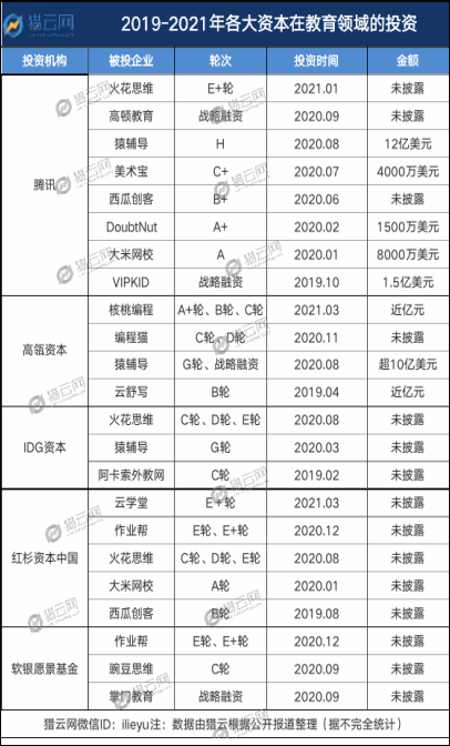 獵云網(wǎng)梳理到,例如騰訊、高瓴資本、IDG資本、軟銀愿景基金、紅杉資本中國(guó)等機(jī)構(gòu),在近兩年對(duì)K12頭部教育公司的投資較為頻繁,大肆下注且金額不低。