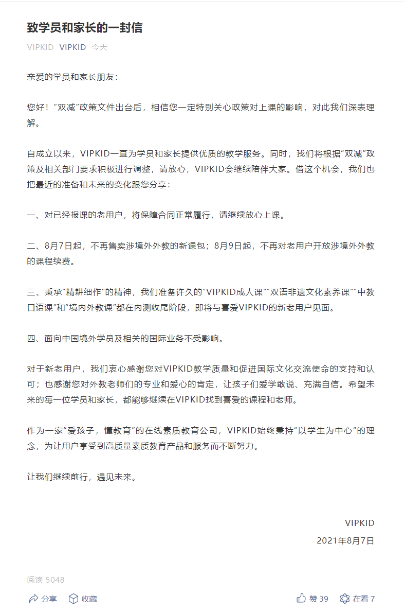 2021-08-07 10:52:58閱讀()互聯(lián)網(wǎng)8月7日消息今天上午,VIPKID通過微信公眾號發(fā)布致學(xué)員和家長的一封信,VIPKID稱對已經(jīng)報課的老用戶,將保障合同正常履行。8月7日起,不再售賣涉境外外教的新課包;8月9日起,不再對老用戶開放涉境外外教的課程續(xù)費。面向中國境外學(xué)員及相關(guān)的國際業(yè)務(wù)不受影響。
