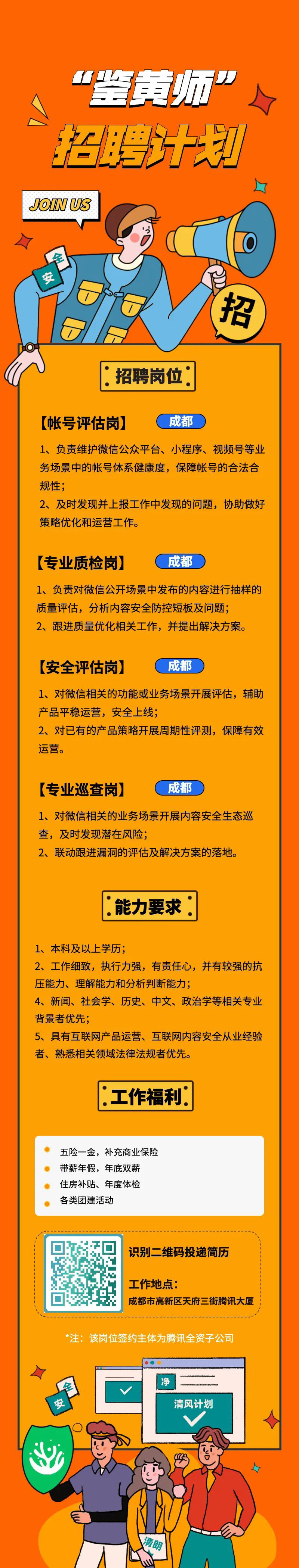 2021-08-12 16:42:04閱讀()互聯(lián)網(wǎng)8月12日消息 近期微信珊瑚安全官方發(fā)布《微信“鑒黃師”招人,速來》,并且公布了公司的相關(guān)崗位招聘,也就是“鑒黃師”招聘計(jì)劃,其中包括賬號(hào)評(píng)估崗、專業(yè)質(zhì)檢崗、安全評(píng)估崗、專業(yè)巡查崗。