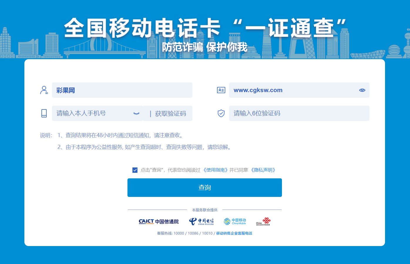 即可查詢你身份證名下所有注冊(cè)手機(jī)卡,查看是否有信息盜用情況,非常方便!
