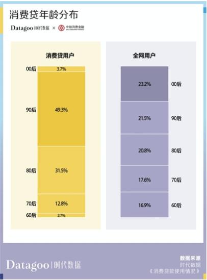 報告顯示,消費貸年齡分布上,90后幾乎占據(jù)半壁江山,占比為49.3%;其次是80后,占比為31.5%。一組數(shù)字顯示,全國有1.75億名90后,其中只有13.4%的年輕人沒有負債,而86.6%的90后都接觸過信貸產(chǎn)品。