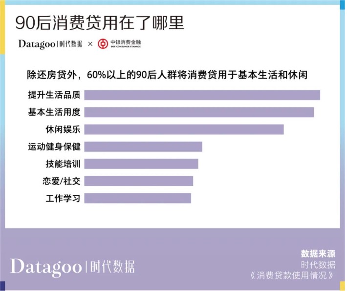 報告認為,除了消費方式上的差異,在最基本的生活需求滿足后,90后也有著與上一輩截然不同的消費觀念。在他們看來,消費是為了更好的體驗,追求更有品質(zhì)感的生活。他們愿意在自己喜愛的領(lǐng)域投入更多的資金。而互聯(lián)網(wǎng)金融產(chǎn)品的誕生與繁榮讓年輕人的消費少了很多約束。除還房貸外,60%以上的90后將消費貸用于提高生活品質(zhì)和休閑。