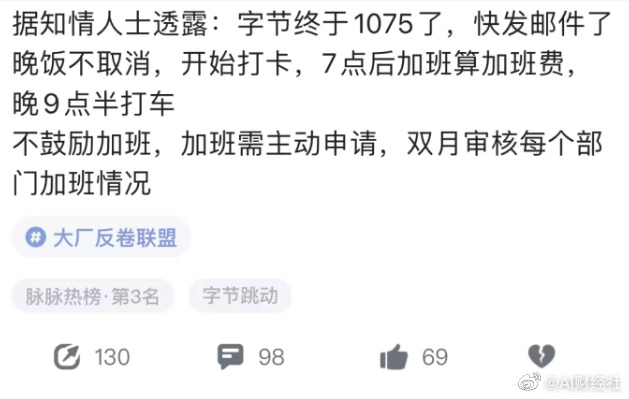消息稱(chēng)字節(jié)跳動(dòng)將開(kāi)啟1075工作制:19點(diǎn)后加班需提交申請(qǐng),休息日加班工資2倍