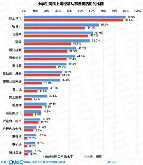 未成年網(wǎng)民經(jīng)常利用互聯(lián)網(wǎng)進(jìn)行學(xué)習(xí)的比例達(dá)到89.6%。 上網(wǎng)聽(tīng)音樂(lè)和玩游戲是主要的網(wǎng)上休閑娛樂(lè)活動(dòng),分別占65.9%和61.0%。上網(wǎng)聊天作為網(wǎng)上溝通社交的主要方式,占58.0%??炊桃曨l和網(wǎng)絡(luò)直播的比例保持較高增長(zhǎng),分別較2018年提升5.7和6.4個(gè)百分點(diǎn)。