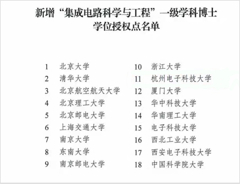 全國首批18所高校,集成電路科學(xué)與工程一級(jí)學(xué)科博士學(xué)位授權(quán)點(diǎn)出爐