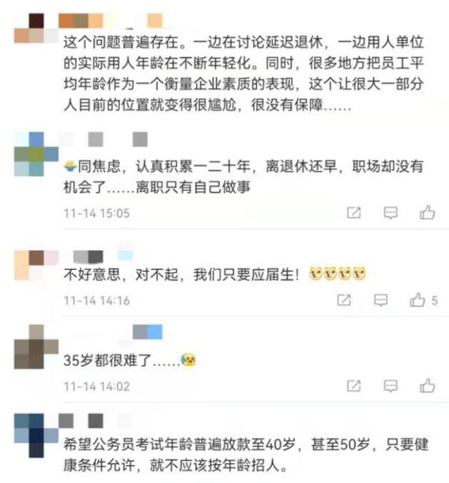 近年來,國家高度重視“35歲現象”,一些地區(qū)公務員招錄已經在放寬年齡限制:比如山東事業(yè)編招考,多年來把招考年齡限制在40周歲以下。浙江今年宣布,對于2022年應屆碩士、博士研究生(非在職人員),放寬到40周歲以下。今年全國兩會,全國人大代表、編劇蔣勝男建議,取消國家公務員報考35歲以下的年齡限制。