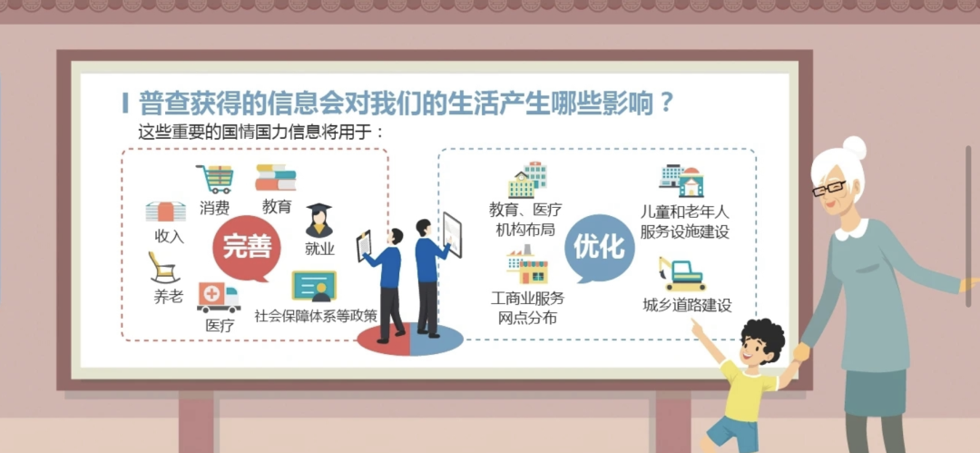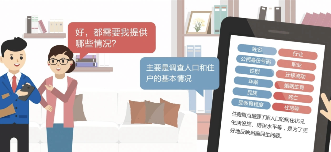 普查主要調(diào)查人口和住戶的基本情況,內(nèi)容包括:姓名、公民身份號碼、性別、年齡、民族、受教育程度、行業(yè)、職業(yè)、遷移流動、婚姻生育、死亡、住房情況等。普查標準時點是2020年11月1日零時。