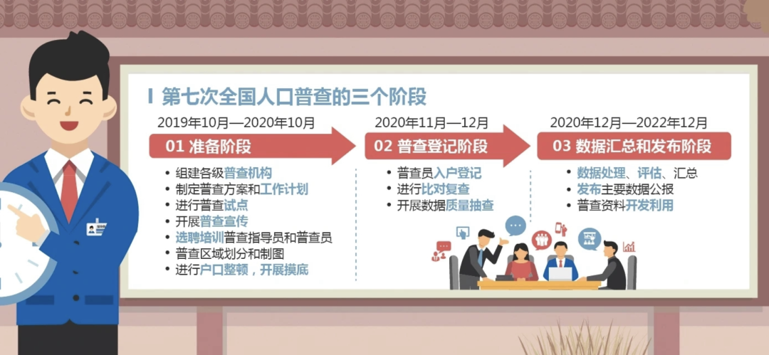 普查內(nèi)容方面,主要調(diào)查人口和住戶的基本情況,內(nèi)容包括:姓名、公民身份號碼、性別、年齡、民族、受教育程度、行業(yè)、職業(yè)、遷移流動、婚姻生育、死亡、住房情況等。此外,普查標準時點是2020年11月1日零時。