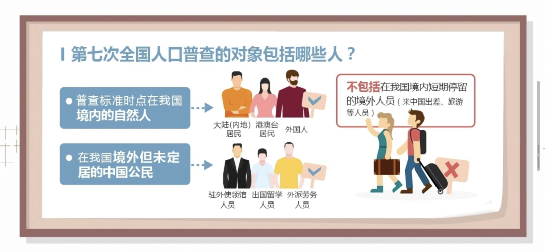 普查對象是普查標準時點在中華人民共和國境內(nèi)的自然人以及在中華人民共和國境外但未定居的中國公民,不包括在中華人民共和國境內(nèi)短期停留的境外人員。