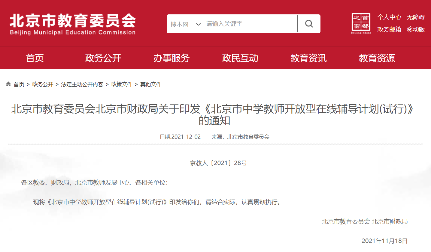 2021-12-04 17:48:41閱讀()互聯(lián)網(wǎng)12月3日消息,北京市教育委員會(huì)12月2日公布北京市教育委員會(huì)、北京市財(cái)政局關(guān)于印發(fā)《北京市中學(xué)教師開放型在線輔導(dǎo)計(jì)劃 (試行)》(下稱《計(jì)劃》)的通知。