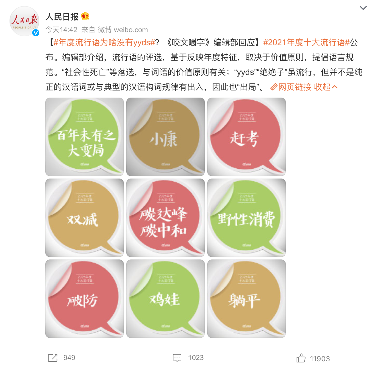 另據人民日報消息,“社會性死亡”等詞語落選是因為與詞語的價值原則有關,“yyds”“絕絕子”雖流行,但并不是純正的漢語詞或與典型的漢語構詞規(guī)律有出入。