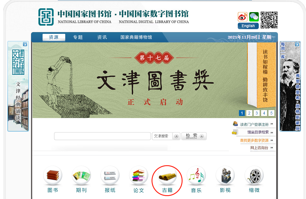 1.在國家圖書館主頁面,選擇“資源”選項,點(diǎn)擊“古籍”。