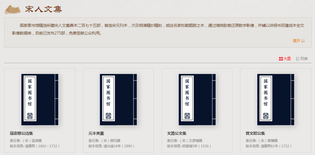 國家圖書館精選所藏宋人文集善本 275 部,首選宋元刊本,次及明清精抄精刻,或經(jīng)名家??鳖}跋之本,通過縮微膠卷還原數(shù)字影像,并輔以詳細(xì)書目建成本全文影像數(shù)據(jù)庫,免費(fèi)呈獻(xiàn)公眾利用。