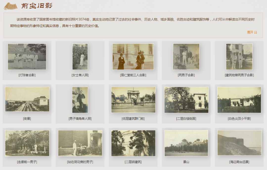 該資源庫收錄了國家圖書館收藏的新舊照片 3074 組,真實(shí)生動地記錄了過去的社會事件、歷史人物、城鄉(xiāng)面貌、名勝古跡和建筑服飾等,人們可從中解讀出不同歷史時期特定事物的形象特征和真實(shí)信息,具有十分重要的歷史價值。