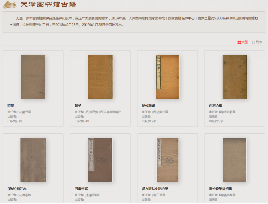 為進(jìn)一步豐富古籍?dāng)?shù)字資源品種和版本,滿足廣大讀者使用需求,2014 年底,天津圖書館向國家圖書館(國家古籍保護(hù)中心)提供總量約 5,800 余種 300 萬拍明清古籍?dāng)?shù)字資源,該批資源經(jīng)加工后,于 2018 年 9 月 28 日、2019 年 1 月 28 日分兩批發(fā)布。