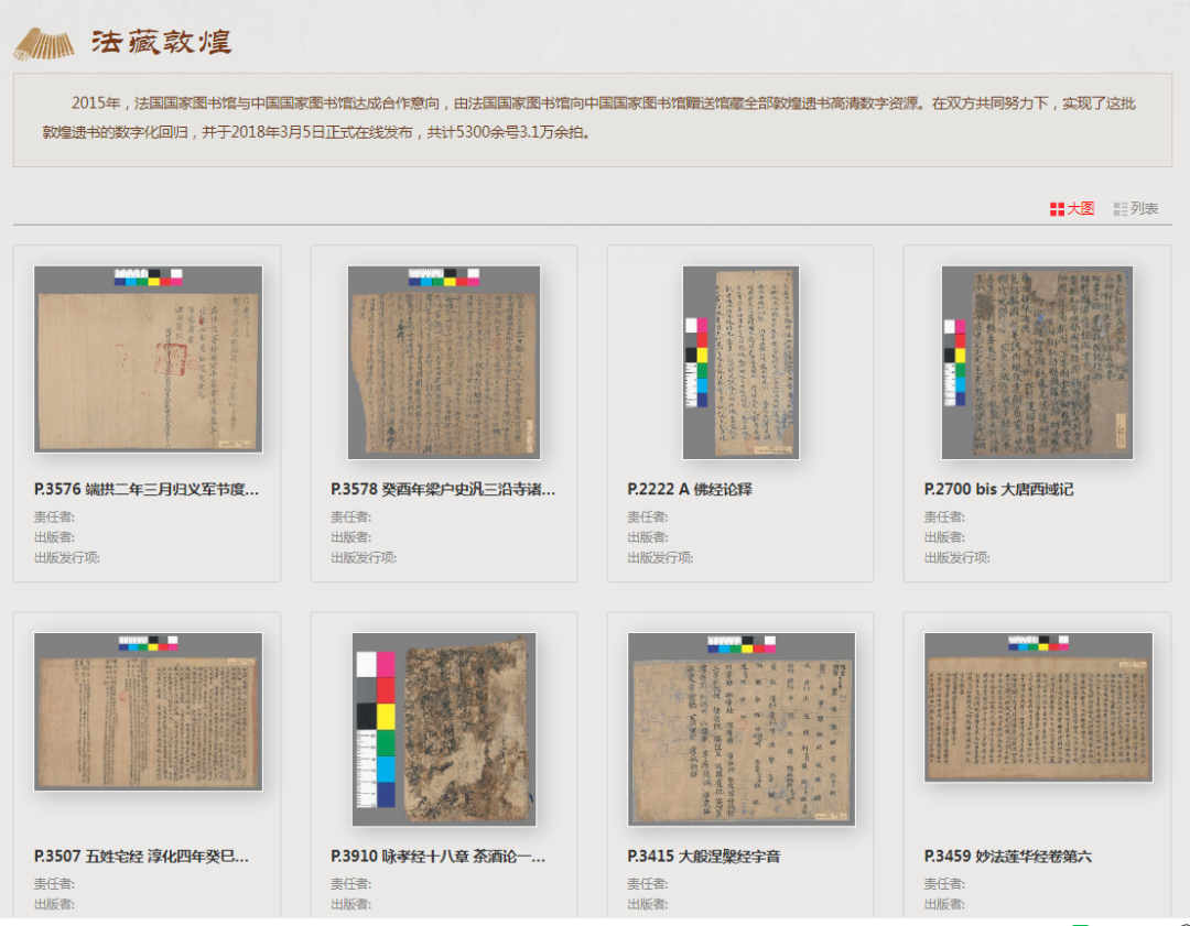 2015 年,法國國家圖書館與中國國家圖書館達(dá)成合作意向,由法國國家圖書館向中國國家圖書館贈送館藏全部敦煌遺書高清數(shù)字資源。在雙方共同努力下,實(shí)現(xiàn)了這批敦煌遺書的數(shù)字化回歸,并于 2018 年 3 月 5 日正式在線發(fā)布,共計 5300 余號 3.1 萬余拍。