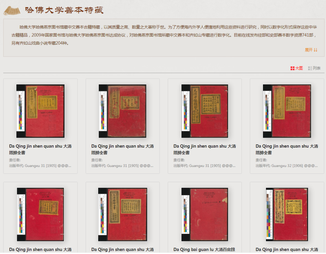 哈佛大學(xué)哈佛燕京圖書館藏中文善本古籍特藏,以其質(zhì)量之高、數(shù)量之大著稱于世。為了方便海內(nèi)外學(xué)人便捷地利用這些資料進(jìn)行研究,同時以數(shù)字化形式保存這些中華古籍精品,2009 年國家圖書館與哈佛大學(xué)哈佛燕京圖書館達(dá)成協(xié)議,對哈佛燕京圖書館所藏中文善本和齊如山專藏進(jìn)行數(shù)字化。目前在線發(fā)布經(jīng)部和史部善本、齊如山戲曲小說專藏數(shù)字資源 900 余種。