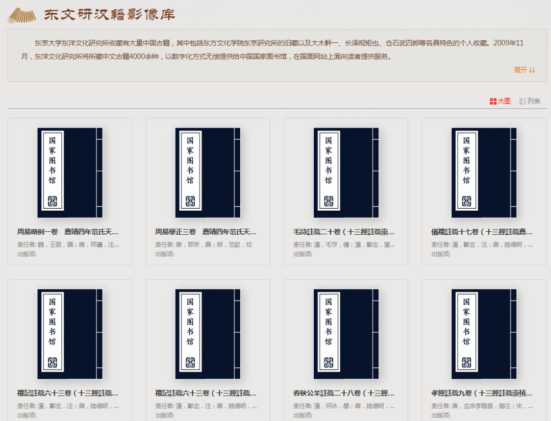 東京大學(xué)東洋文化研究所收藏有大量中國古籍,其中包括東方文化學(xué)院東京研究所的舊藏以及大木幹一、長澤規(guī)矩也、倉石武四郎等各具特色的個人收藏。2009 年 11 月,東洋文化研究所將所藏中文古籍近 4000 種,以數(shù)字化方式無償提供給中國國家圖書館,在國圖網(wǎng)站上面向讀者提供服務(wù)。