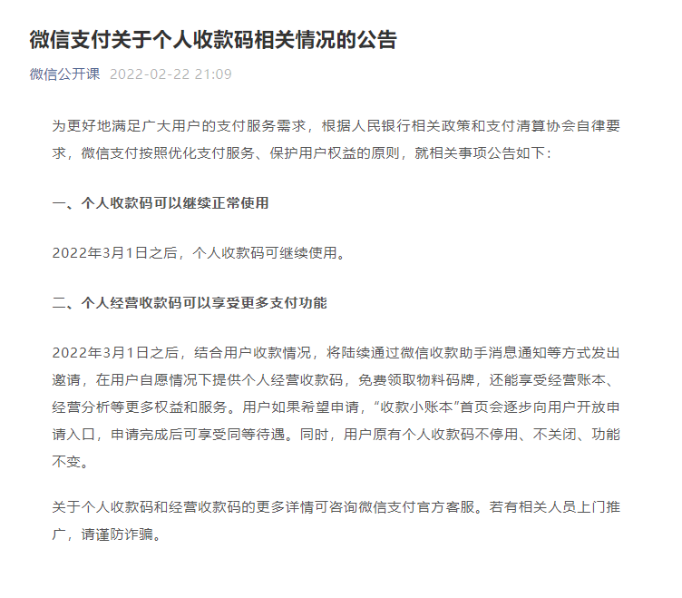 2022-02-23 15:40:46閱讀()互聯(lián)網(wǎng)2月22日消息,今天微信官方發(fā)布關(guān)于個人收款碼相關(guān)情況的公告,為更好地滿足廣大用戶的支付服務(wù)需求,根據(jù)人民銀行相關(guān)政策和支付清算協(xié)會自律要求,微信支付按照優(yōu)化支付服務(wù)、保護(hù)用戶權(quán)益的原則,就相關(guān)事項公告如下: