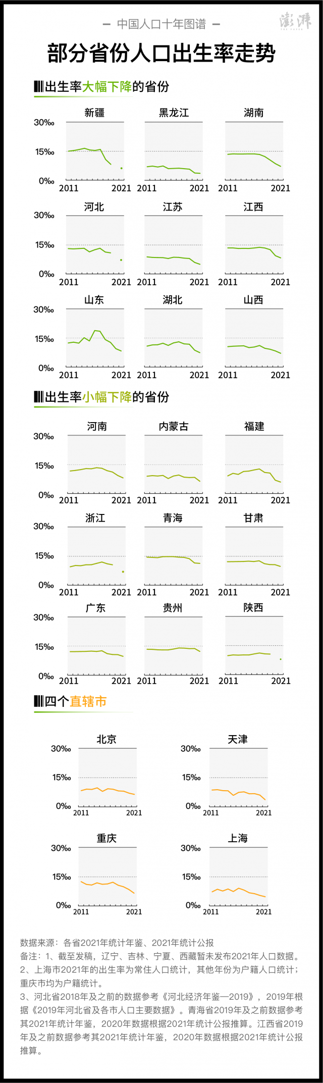 具體到2021年,截至發(fā)稿,吉林、寧夏、西藏、遼寧暫未發(fā)布2021年人口數(shù)據(jù),安徽、廣西、海南、四川、天津公布了2021年常住人口數(shù)據(jù),但未公布出生人口、出生率和人口自然增長(zhǎng)率等數(shù)據(jù),而江蘇、重慶、黑龍江、北京、青海公布了2021年出生率和人口自然增長(zhǎng)率,未公布出生人口,澎湃新聞?dòng)浾吒鶕?jù)出生率*(2021年末常住人口+2020年末常住人口)/2進(jìn)行估算。