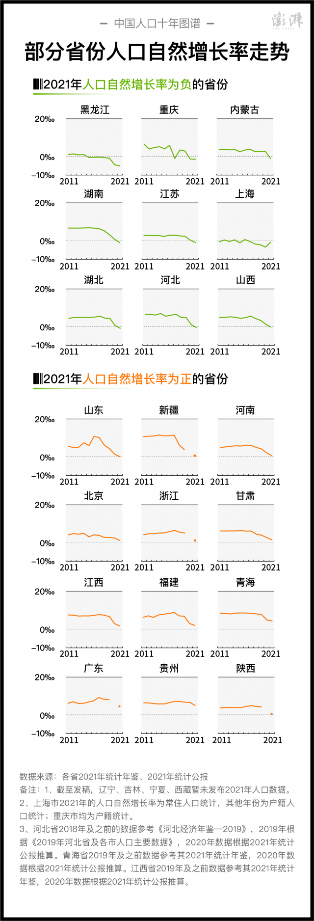 部分省份近十年人口自然增長(zhǎng)率走勢(shì) 制圖 澎湃新聞 晁嘉笙、彭艷秋