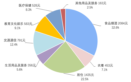 一季度,全國居民人均食品煙酒消費(fèi)支出2084元,增長4.9%,占人均消費(fèi)支出的比重為32.6%;人均衣著消費(fèi)支出453元,增長3.6%,占人均消費(fèi)支出的比重為7.1%;人均居住消費(fèi)支出1435元,增長6.7%,占人均消費(fèi)支出的比重為22.5%;人均生活用品及服務(wù)消費(fèi)支出356元,增長4.8%,占人均消費(fèi)支出的比重為5.6%;人均交通通信消費(fèi)支出791元,增長12.7%,占人均消費(fèi)支出的比重為12.4%;人均教育文化娛樂消費(fèi)支出583元,增長6.9%,占人均消費(fèi)支出的比重為9.1%;人均醫(yī)療保健消費(fèi)支出528元,增長9.1%,占人均消費(fèi)支出的比重為8.3%;人均其他用品及服務(wù)消費(fèi)支出163元,增長17.1%,占人均消費(fèi)支出的比重為2.5%。