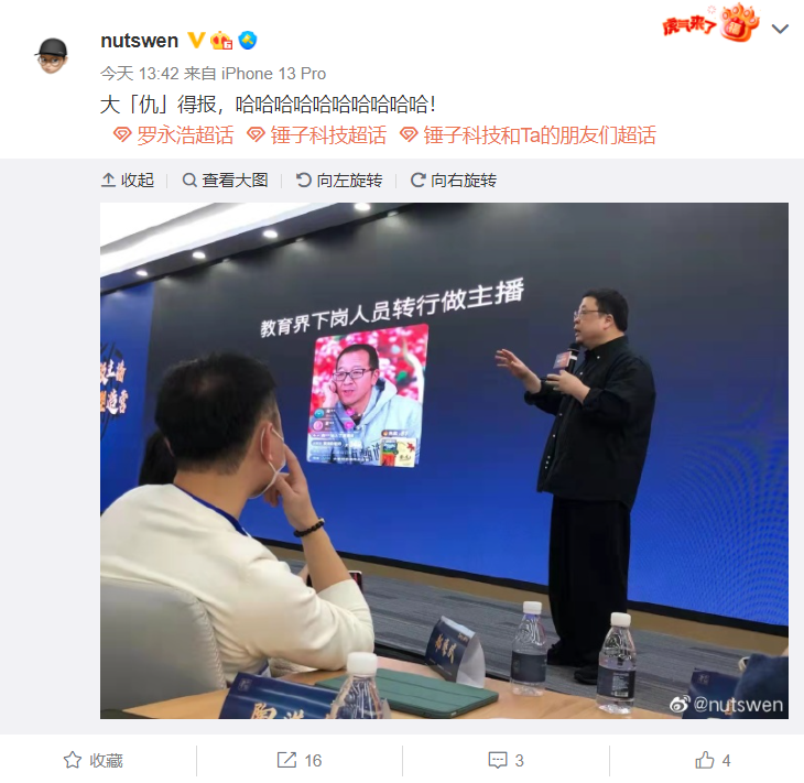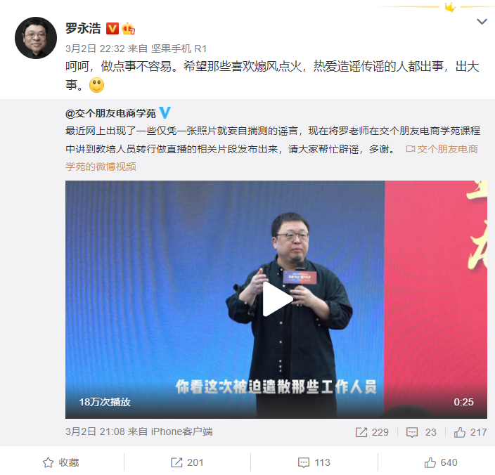 而后,交個(gè)朋友電商學(xué)苑微博把相關(guān)的直播視頻片段發(fā)布了出來(lái),羅永浩轉(zhuǎn)發(fā)繼續(xù)表示,“呵呵,做點(diǎn)事不容易。希望那些喜歡煽風(fēng)點(diǎn)火,熱愛(ài)造謠傳謠的人都出事,出大事。”