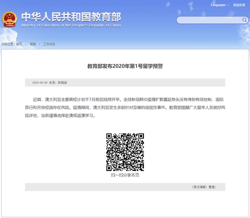 您的位置:首頁 / 行業(yè)資訊 / 教育部發(fā)布2020年第1號留學(xué)預(yù)警