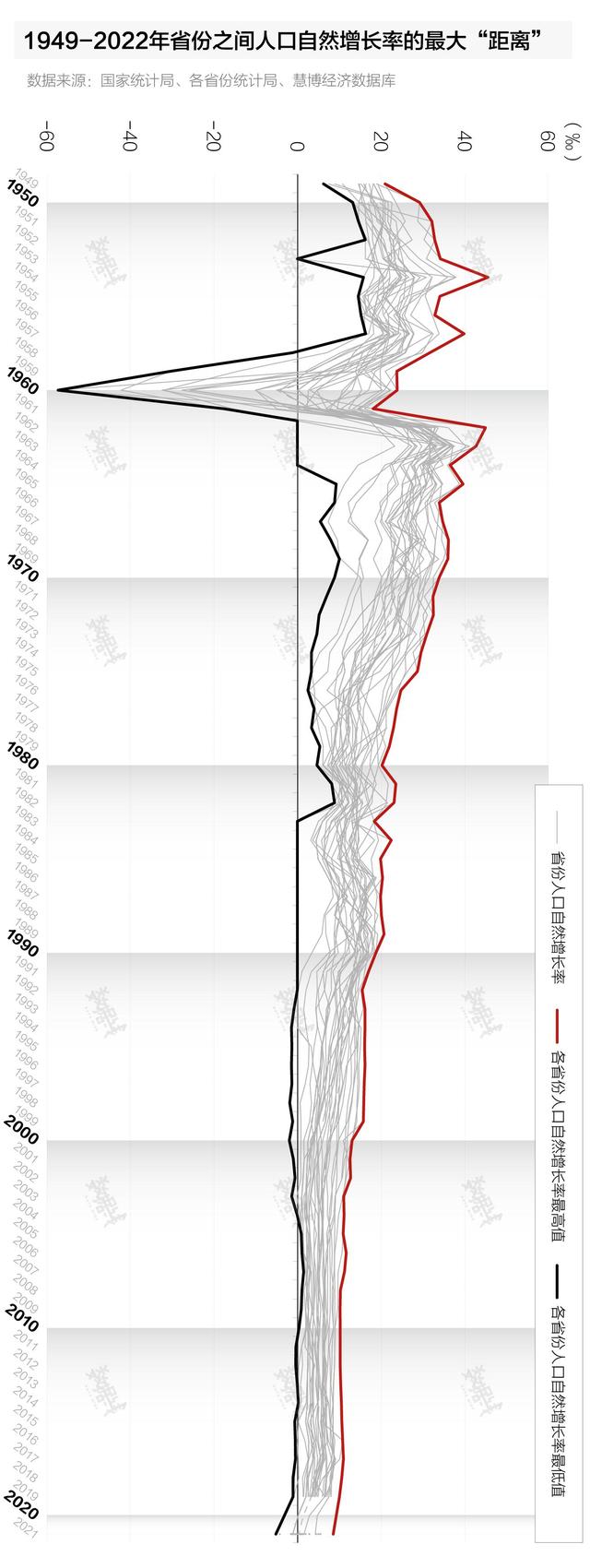 界面數(shù)據(jù)進一步統(tǒng)計后發(fā)現(xiàn),1960年以來,各省份之間人口自然增長率的跌勢在趨緩、“差距”在縮小。
