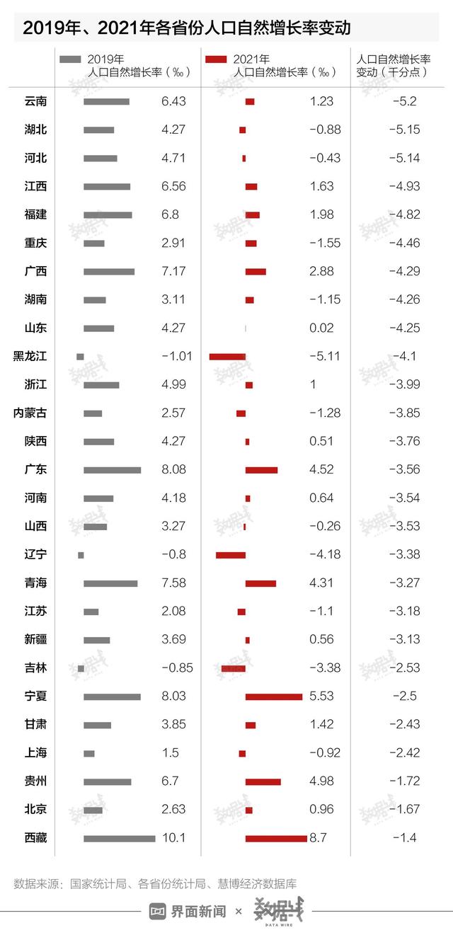 分各省份來看,據(jù)界面數(shù)據(jù)測算,在有人口自然增長率可查的27個省份中,以2019年數(shù)據(jù)為基準線(2020年僅3個省份公布了人口自然率數(shù)據(jù)),2021年,人口自然增長率下降最大的3個省份是云南、湖北、河北,跌幅超5個千分點。