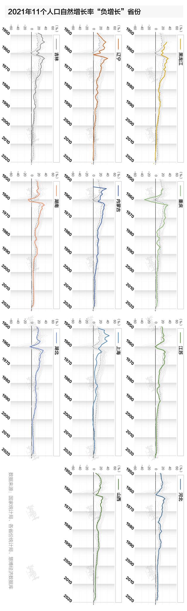 截至2021年,全國多省份已開啟人口“負增長”。據(jù)界面數(shù)據(jù)統(tǒng)計,在有人口自然增長率數(shù)據(jù)公布的27個省份中,11省份人口自然增長率已為負值,占到近4成。其中,東北地區(qū)黑龍江、遼寧人口自然增長率“最嚴重”,分別為-5.11‰、-4.18‰。其次是重慶、內(nèi)蒙古,分別為-1.55‰和-1.28‰。