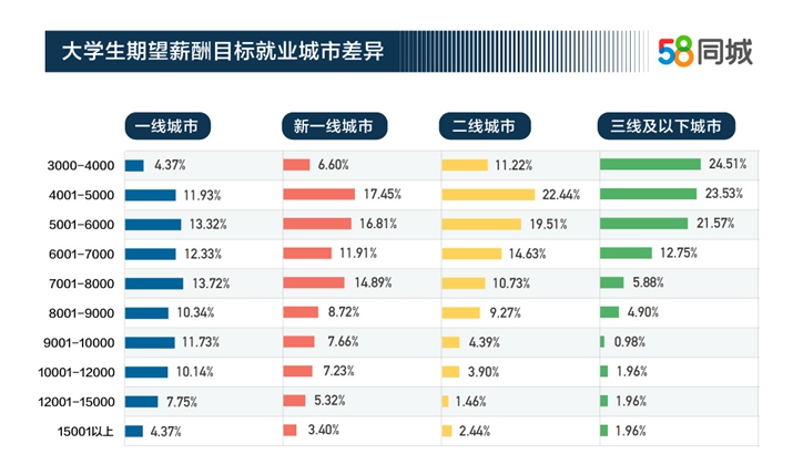 報告顯示,大學生平均期望月薪為7409元,企業(yè)對大學生平均支付月薪為7094元,大學生的收入水平基本符合預期構(gòu)想。大學生就業(yè)選擇的城市層級越高,薪酬期望也越高。首選在一線城市就業(yè)的大學生平均期望月薪為8151元,首選在新一線城市就業(yè)的大學生平均期望月薪為7394元,首選在二線城市就業(yè)的大學生平均期望月薪為6478元,首選在三線及以下城市就業(yè)的大學生平均期望月薪為5696元。