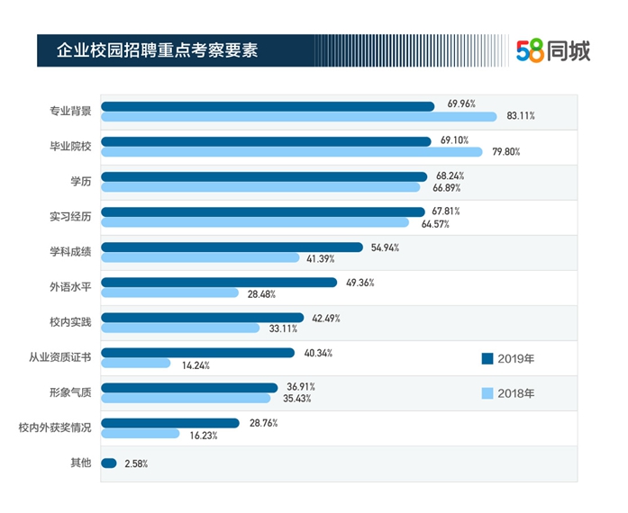 在企業(yè)校園招聘中,人才篩選要素中排名前四的依次是專業(yè)背景、畢業(yè)院校、學歷、實習經(jīng)歷。與去年相比,雇主對于專業(yè)背景、畢業(yè)院校的選擇比例有所下降,分別下降了13.15%和10.70%;而對學歷和實習經(jīng)歷的選擇比例有所提升,分別上升了1.35%和3.24%。隨著產(chǎn)業(yè)的跨界融合發(fā)展,新晉職場者常常要從事跨專業(yè)工作,企業(yè)對專業(yè)背景的關(guān)注度有所下降。